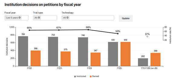 Patent Office statistics available at https://www.uspto.gov/dashboard/ptab/trials.html.